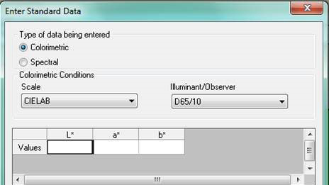 在这个新窗口中指定是输入比色值还是光谱值。你还需要选择光源和观察者角度以及色标。一旦这些参数设置完毕,你就可以在相应的数值框中输入你的数值。